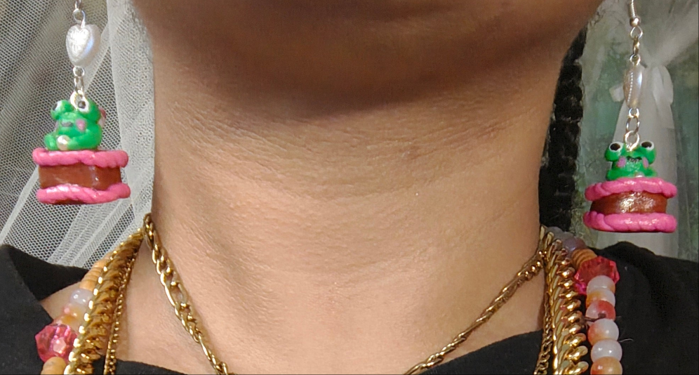 Indulge in these one-of-a-kind Faelyn Frog Cupcake Earrings, carefully handcrafted for a unique touch. Each earring is individually painted, making them imperfectly perfect. Add a fun and whimsical touch to your outfit with these special handmade earrings.